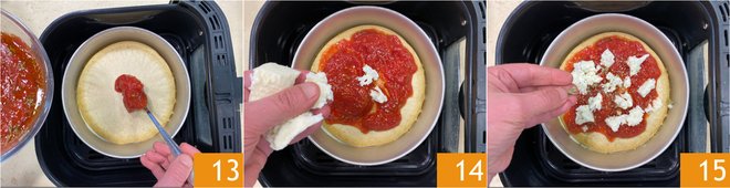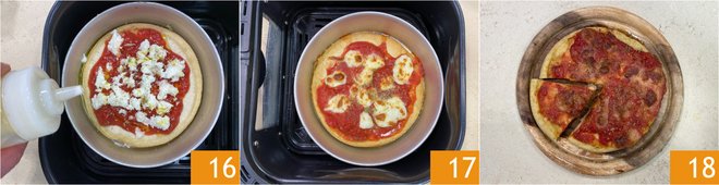 Finish with a drizzle of oil 16 and cook for another 8 minutes, still at 392°F. Once cooked 17, your liquid pizza in air fryer is ready to be enjoyed 18!