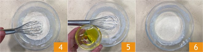 Gradually incorporate the water while stirring with a whisk 4. Lastly, add the oil 5 and mix to combine and obtain a homogeneous mixture 6. You should achieve a thick batter.