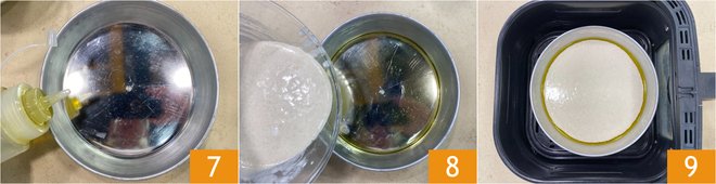 Grease a pan with oil with a diameter of 8 inches 7 and pour the batter inside 8. Place the pan in the air fryer (we used a fryer with a capacity of 6 liters) and cook at 392°F for 5 minutes 9.