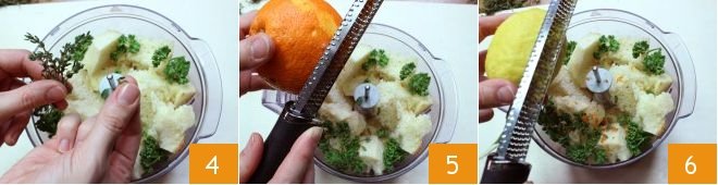 marjoram leaves, thyme 4, then grate the zest of an orange 5 and a lemon 6,