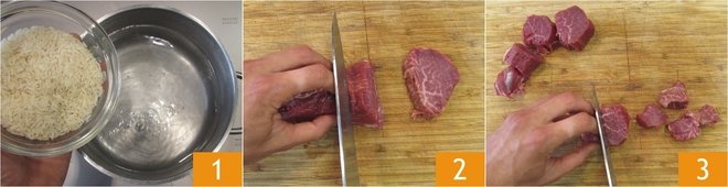 To prepare lomo saltado, first bring a pot of salted water to a boil and cook the rice that will serve as the accompaniment 1. While the rice is cooking, cut the beef filet first into slices 2 and then into fairly large pieces 3.