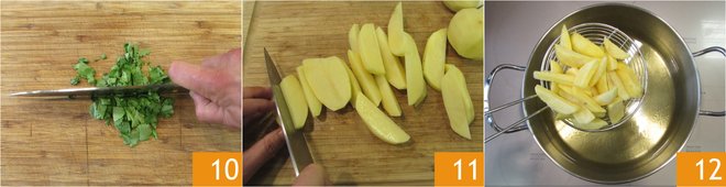Coarsely chop the cilantro 10. Finally, peel and cut the potatoes into wedges 11 and fry them in hot vegetable oil 12.