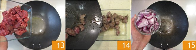 In a wok or non-stick pan, sear the meat with a drizzle of oil over very high heat for about 5 minutes to give it a quick cooking 13, then set it aside 14. In the same pan, add the onions 15.