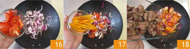 Add the tomatoes 16 and the aji amarillo 17. Stir-fry everything for a few minutes, always over high heat, then add the seared meat 18.