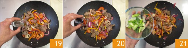 First deglaze with vinegar 19 and then with soy sauce 20, and continue to stir-fry everything for another 7 minutes, stirring often. Finally, add the scallion 21.
