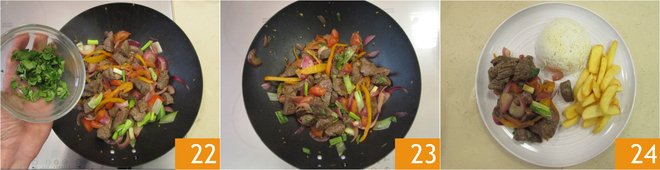 Season with cilantro 22 and mix well 23. Your lomo saltado is ready to be served with rice and french fries 24!