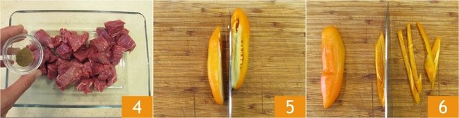 Transfer the meat to a container, season with cumin 4 and a pinch of salt, and set aside while you prepare the rest of the ingredients. Split the aji amarillo lengthwise 5, remove the seeds inside, and cut it into strips 6.