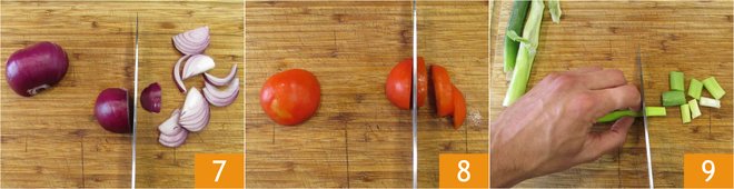 Peel and cut the onion into thick slices 7. Slice the tomatoes 8 and cut the green part of the scallion into chunks 9.