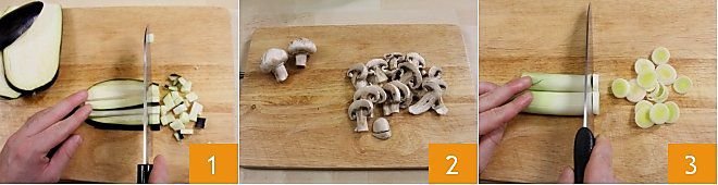 To prepare lorighittas with eggplants and mushrooms, first cut all the vegetables. Wash, dry, and dice the eggplant 1; clean the mushrooms and slice them 2; remove the outer leaves of the leek and cut it into rings 3.