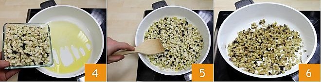 Sauté the eggplant cubes in a non-stick pan with a drizzle of olive oil 4, stirring with a wooden spoon 5 until they are well browned 6. Season with salt and pepper.
