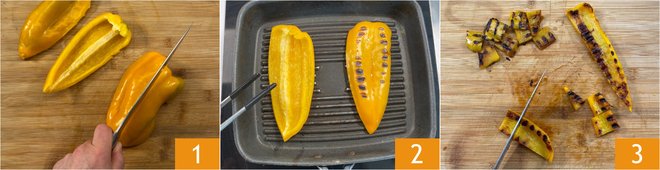 To prepare the lunch box with couscous and salmon, start with the vegetables: clean the bell pepper of seeds and internal filaments, then cut it into 4 long strips 1. Place the pepper on a hot grill and grill until grill marks appear 2. Finally, cut it into 3/4-inch pieces 3.