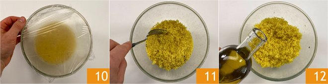 Cover with plastic wrap and let it rest for 5 minutes 10. After this time, the water will have been absorbed, so fluff the couscous with a fork 11 and drizzle with a little oil 12.