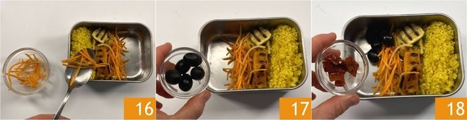 You are ready to transfer the ingredients to your lunch box: couscous on one side 14, then zucchini 15 and bell peppers 15.