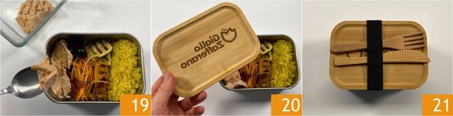 Finally, add the grilled salmon 19. Close with the lid 20: your lunch box is ready to be transported... remember to shake before enjoying 21!
