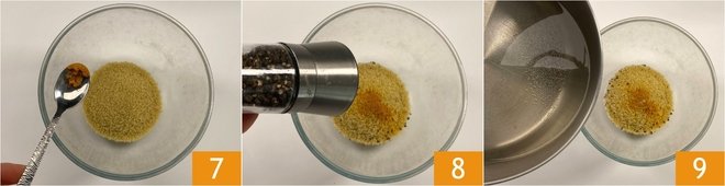 Meanwhile, bring a small pot of water to a boil. Put the couscous in a bowl and season with turmeric 7, salt, and pepper 8. Pour boiling water until it covers the couscous by about 1/2 inch 9.