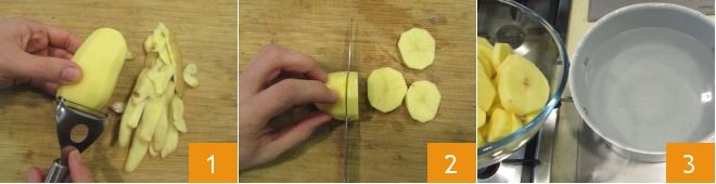 To prepare Lyonnaise potatoes, first peel the potatoes 1 and cut them into slices about 1/2 inch thick 2, then boil them in salted water for 15 minutes 3.