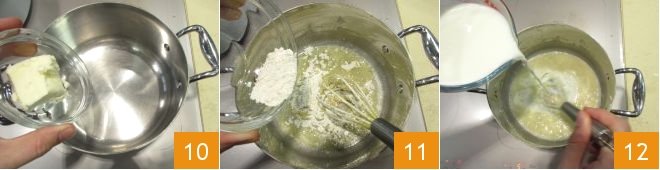 Now you can move on to making the béchamel sauce: put the butter in a saucepan 10 and melt it over low heat, meanwhile heat the milk in another saucepan; when the butter has melted, turn off the heat and add the sifted flour while stirring with a whisk to prevent lumps 11. Once all the flour is added, place the saucepan back on low heat and continue to stir until it turns hazel in color, then pour in the hot milk in a thin stream, still stirring 12.