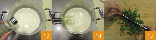 Flavor the mixture with nutmeg, salt, and pepper to taste 13 and continue stirring over low heat 14 until the béchamel sauce begins to thicken, or when it falls from the whisk forming a ribbon. For further information, you can consult the recipe for Béchamel sauce. Lastly, wash and finely chop the parsley 15, and preheat the oven to 356°F in static mode.