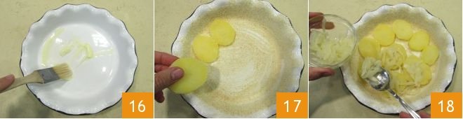 At this point, you're ready to assemble the Lyonnaise potatoes: take a 10-inch diameter baking dish, grease it with butter 16 and sprinkle with breadcrumbs; form the first layer by placing the potatoes on the bottom of the dish without overlapping them 17, then add half of the stewed onions 18,