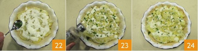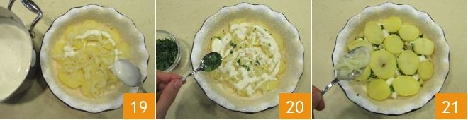 cover with some béchamel sauce 19 and sprinkle with the chopped parsley 20. Repeat the layers by adding more potatoes, onions 21,