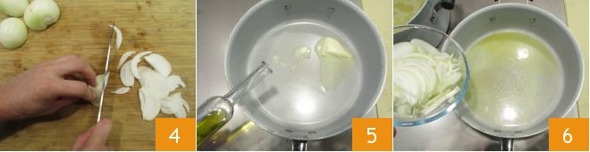 Meanwhile, you can prepare the onions: peel and halve them, then cut them lengthwise into thin strips 4. In a pan, melt the butter with the oil over low heat 5, then add the onions,