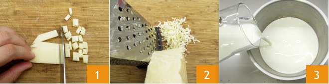 To make the mac and cheese donuts, first put a pot of water on to boil for the pasta, then dice the cheddar and provolone 1. Grate the Edam and Grana Padano PDO with a coarse grater 2. Pour the milk and cream into a small pot 3, season lightly with salt, pepper, and bring to just below boiling.