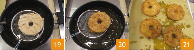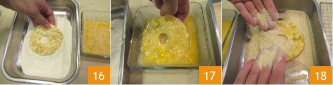 Now take 3 bowls and fill them with flour, eggs, and breadcrumbs. Coat each donut first in the flour 16, then in the egg 17, and finally in the breadcrumbs to cover them evenly 18.
