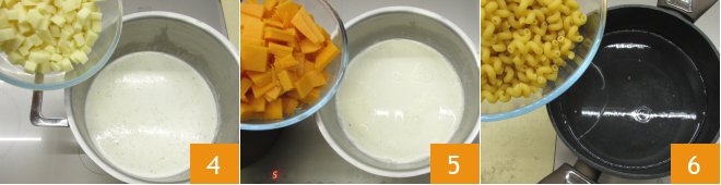 At this point, add the provolone 4 and cheddar 5 and melt the cheeses over medium-low heat for about 12 minutes, stirring gently with a whisk. Meanwhile, the water should have come to a boil, so salt it and cook the pasta al dente 6.