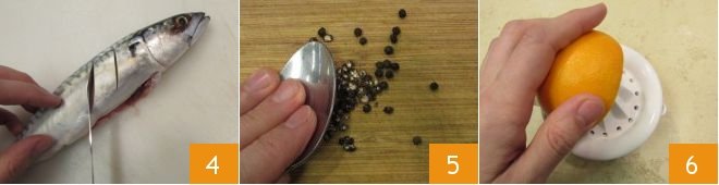Now make diagonal cuts on the sides 4 and set aside. Prepare the marinade ingredients: crush the peppercorns with the back of the spoon to release their aroma better 5, then squeeze the orange juice 6.