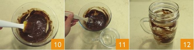 and mix well with a spatula or whisk until you obtain a smooth and homogeneous mixture 10. Now you're ready to assemble your milkshake: take the glass jars and brush the inside with ganache using a brush 11, then place them in the freezer for a couple of minutes so that the chocolate sets 12.