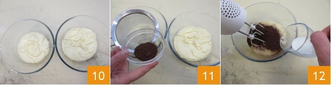 Divide the batter into two bowls 10, in one add the sifted cocoa 11 and 30 ml of milk 12, so that it has the same consistency as the light one and bakes similarly;