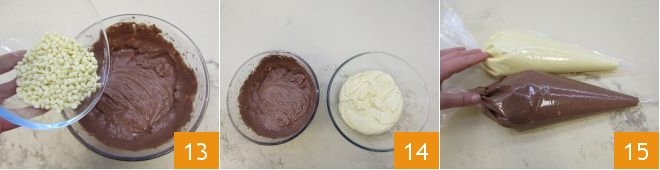 finally, add the previously frozen and floured white chocolate chips 13. You will thus obtain two two-tone batters 14. Mix to combine the mixture. Transfer the batters into two separate disposable piping bags without a nozzle 15,