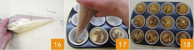 to achieve a marbled effect, place the two piping bags in a larger piping bag 16, cut the tip, and pour the batter into a 12-muffin tin lined with paper cups, the batter should reach the top 17. Bake the muffins in a static oven at 356°F for 30 minutes (or in a fan oven at 320°F for 20 minutes). Once baked, remove your marbled cocoa muffins with white chocolate chips from the oven and let them cool slightly before enjoying them 18.