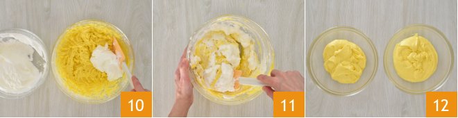 Use a spatula to fold in the whipped egg whites in two parts: the first part will help soften the mixture 10, and the second will add lightness, so fold gently, moving from the bottom up 11. At this point, divide the batter into two bowls 12.