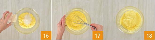 Move to the other batter, add the shredded coconut 16, and mix gently with the whisk again 17. This avoids deflating the mixture 18.