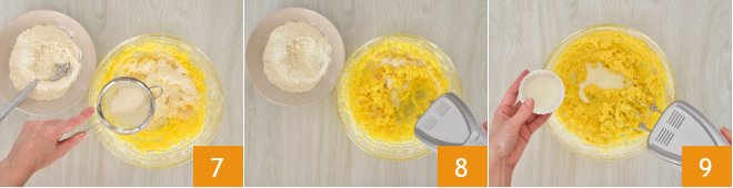 Sift the flour and baking powder into the mixture 7, adding a little at a time while continuing to mix with the beaters on a lower speed 8. Once the mix is absorbed, pour in the milk and remove the beaters once incorporated 9.
