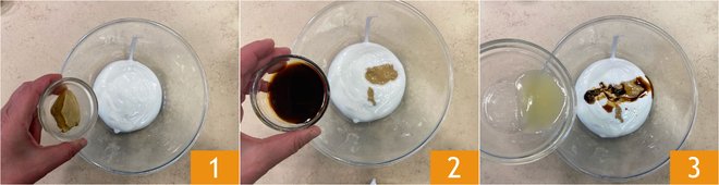 To prepare marinated chicken, first pour the yogurt into a bowl. Add the mustard 1, soy sauce 2, and lemon juice 3.
