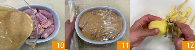 Pour the remaining sauce on top 10 and cover with plastic wrap 11. Let it marinate for 30 minutes in the refrigerator. In the meantime, peel the potatoes 12.