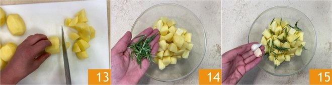 Then cut them into large cubes 13 and transfer them to a bowl. Add the rosemary 14 and garlic 15.