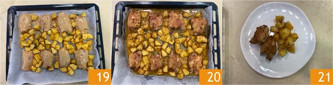 Neatly arrange the chicken and potatoes on a baking sheet lined with parchment paper 19. Bake in a preheated static oven at 392°F for 45 minutes, activating the grill for the last 10 minutes for a crispy crust. Remove from the oven 20 and serve your marinated chicken with potatoes immediately 21!