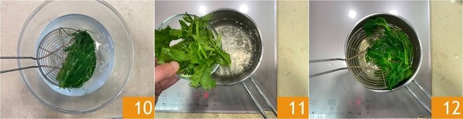 Then immediately immerse in ice water to keep the color vibrant 10, set aside. Do the same with the leaves of the two celery stalks, blanch in the same water 11, drain 12,