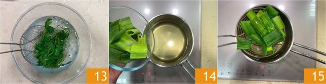 immerse in the bowl with ice water 13, then set aside. Lastly, peel the leek and blanch the leaves 14 for 1 minute. Again, drain 15