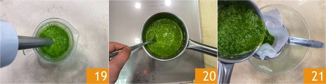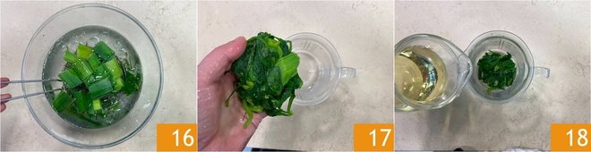 Pass them in ice water too 16. Gather all the blanched herbs, squeeze them, and place them in a pitcher 17, add the seed oil 18.
