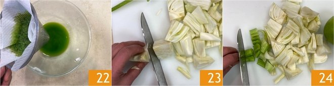Collect the oil and set it aside 22. Now for the extract: clean and cut the fennel into pieces 23, do the same with the celery 24.