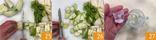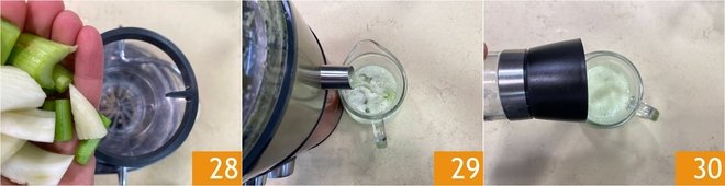Place the cut fruit and vegetables in the extractor 28 and collect the juice in the pitcher 29. Season with salt 30 and set aside.