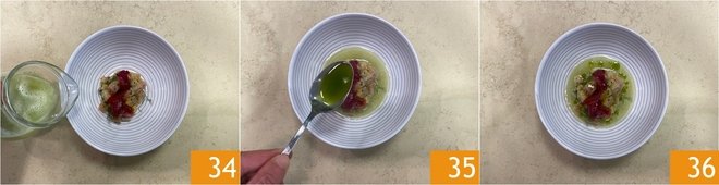 Complete by pouring the apple extract 34 and the green oil 35. Serve your seafood appetizer immediately 36.