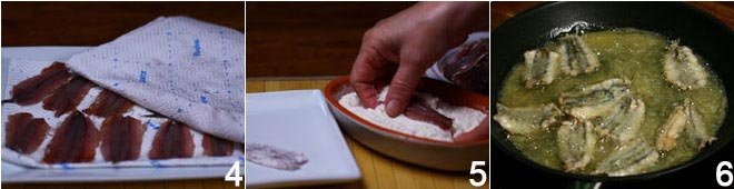 Quickly wash and dry the anchovies by blotting them with paper towels 4, then coat them in flour 5 and fry them in hot olive oil 6, turning them on both sides; place the fried anchovies on paper towels to absorb the excess oil.