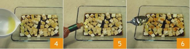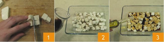 To prepare the marinated tofu and vegetable skewers, first cut the tofu into cubes of about 3/4 inch 1. Transfer the cubes to a baking dish and add the marinade ingredients: the soy sauce 2, the oil 3,