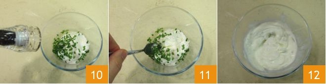 Add salt, pepper 10, and stir with a teaspoon 11 to obtain a smooth sauce 12.