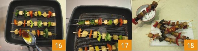 Heat a grill well and place the skewers on it, drizzling them with the marinade liquid 16. Cook the skewers for a total of 6 minutes, turning them on all sides 17. Once cooked, serve your marinated tofu and vegetable skewers immediately, accompanied by the yogurt sauce 18!